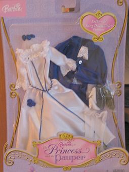Barbie as The Princess and the Pauper Ken as King Dominick and Barbie as The Princess and the Pauper Ken as King Dominick AA are now appearing in stores ($19.99). (Both Caucasian and AA versions are available). Ken comes dressed in the King Dominick outfit (burgundy jacket & knickers, white shirt w/ascot, and a white & gold vest) with crown, "holding" a gift box with a tiara on top. The package includes the Julian outfit (white shirt, blue & gold vest, and navy knickers) with a book & pink rose. There is one pair of gold vinyl boots to share between the two outfits. Both versions feature the enlarged head molds. The Caucasian version uses an enlarged 1997 Ken head mold while the AA version uses the 1991.97 Modified Jamal, with new markings "1991-1997" for the enlarged version. I have begun to list these enlarged head molds separately on the Keeping Ken/Ken Parts Department page. Also, Barbara in Canberra, Australia sent these two photos below of the fashions connected with the line. More info about Barbie® as The Princess and the Pauper Ken® as King Dominick™ and Julian™ the Tutor on the Keeping Ken The Millennium Era 1999-Beyond page.