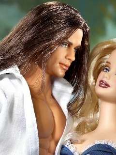 Jude Deveraux "The Raider" Barbie® & Ken® Gift Set (August 2003) This gift set capitalizes on the strong base of romance novel fans and has a strong tie to a best-selling romance novel, The Raider, written by Jude Deveraux. This gift set is the first gift set to feature Barbie and Ken as romance novel characters. Barbie is featured wearing a violet blue dress that falls off her shoulders with long blonde tousled hair. An overskirt of periwinkle chiffon is pulled up at the left hip to reveal a very full underskirt of violet blue jacquard. Complete with a sash of teal iridescent chiffon and a small bouquet of flowers, Barbie is just stunning! Ken is brown, long side swept hair and comes wearing a sheer white cotton shirt, tight black pants accented with a black belt.