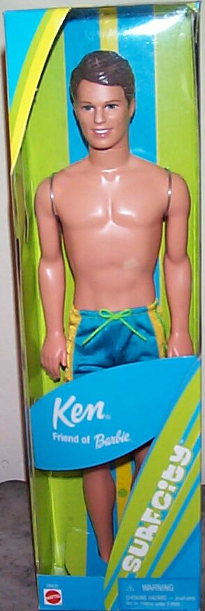 Officially, Surf City Ken is the second 2000 version, and he retailed for $4.99. The hair is painted brown with lighter brown highlights. His eyes are painted two colors of a turquoise blue color. If you aren't already stoked enough, the box back has a warning: "Beware! It's beachwear that's hot! In sizzling color combos that are as bright as the summer sun, everyone is ready for the surf or the scene". Ken's swim trunks are a mixture of turquoise blue front with yellow back. Lime green ribbon is added on the sides along with a lime green tie at the waist. I absolutely love the fact that Mattel has moved away from the standard pink box color to "match" the swim trunks inside. The box is a lot of fun and will spice up the look of your collection. I especially like the additional touch of a surfboard shape cut-out window on the side of the box. Too cool. Ken comes with a cardboard surfboard that matches his color theme.